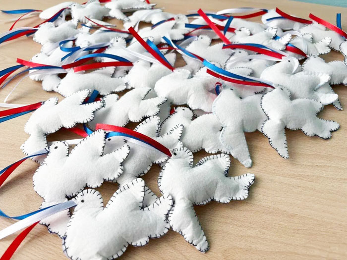 Голубь, выбранный в качестве символа, олицетворяет мир и доброту. Каждый талисман - это частичка любви и теплоты, которую учащиеся передают нашим бойцам, желая им смелости, решимости, удачи, крепкого здоровья, неисчерпаемого мужества и сил.